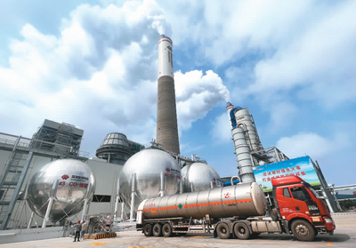 国家能源集团江苏泰州电厂,一辆二氧化碳运输车在等待装载二氧化碳。 本报记者 廖睿灵摄