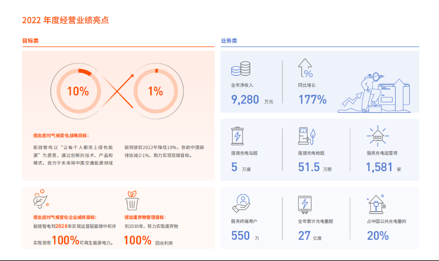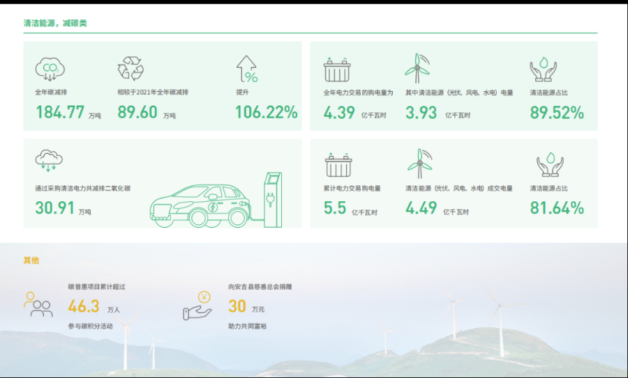 在全球低碳转型的趋势下,公司2022年业绩指标取得显著增长。能链智电实现全年碳减排184.77万吨,相较于2021年全年碳减排89.6万吨,提升106.22%。