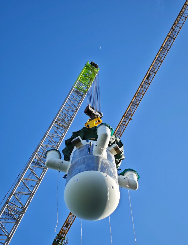 这是玲龙一号核岛设备安装关键路径上的第一个里程碑节点,是核反应堆模块化制造和安装的一次“首秀”,代表全球核能小型化迈出了历史性一步,标志着我国在模块式小型堆建造上走在了世界前列。为确保工程质量全面可控,项目团队统筹谋划设备验收、出厂、转运、接收、吊装工作,在监管当局全程严格监督下,海监、设备厂商、现场建设团队通力配合,有效克服了天气复杂多变、设备稳定性要求高、首堆经验缺乏等多种困难,终于达成了“充分准备,一次成功”的目标。