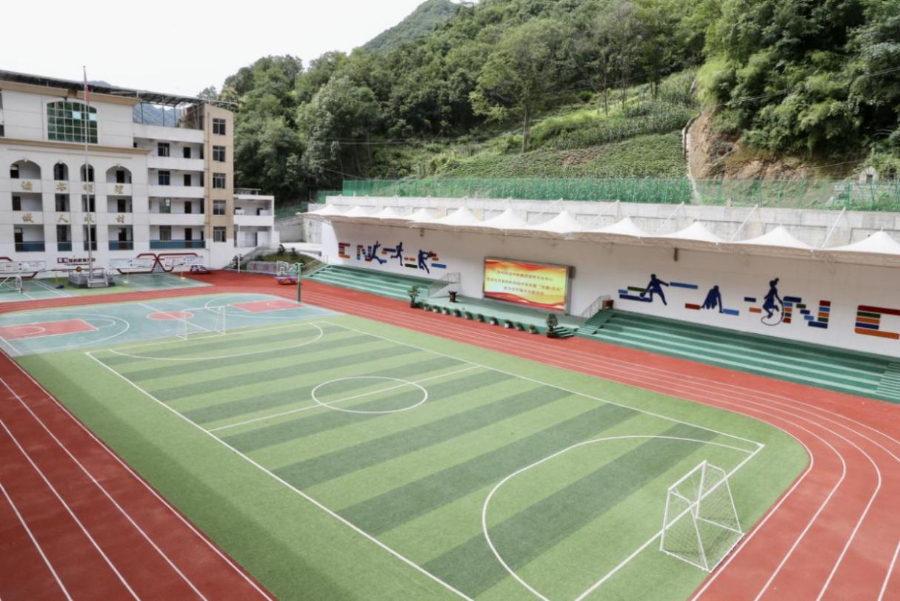 夏日的阳光播撒在红绿相间的操场上,夏日的暖风也在吹动着操场上的树丛,远处几名学生在崭新的跑道上肆意奔跑着,白河县构朳初级中学校园里的一切都看着那么新、那样亮。但在2021年8月之时,这里的校园还不是眼前这副模样:受连续强降雨影响,白河县构朳初级中学教学楼因山体滑坡损毁,房顶坍塌损毁、房屋倾倒、桌椅严重损坏、操场也被山体滑坡的石块和泥土堆满。