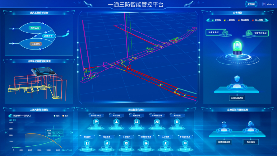 矿井智能通风与应急控风技术装备由矿井全局通风智能感知系统、三维矿井通风智能管控平台、矿井成套调风控风智能设备设施和灾变风流应急调控技术装备构成,是煤矿井下事故发生时的“安全卫士”,能有效保证井下作业空间风量充足,防止风流中有毒有害气体浓度与粉尘浓度超标,避免火灾、粉尘灾害、瓦斯灾害事故的发生。