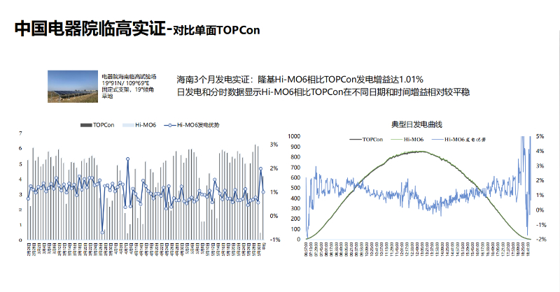 来自隆基绿能中央研究院研究员胡国波博士,向大家分享了中国电器院、河南南阳工商业屋顶的实证案例,实证表明采用隆基绿能HPBC电池的Hi-MO X6组件在同等条件下比单面的TOPCon组件有1%以上的发电增益。