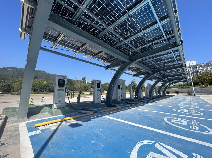 据悉,该站位于沙县区大洲中石化加油站停车场内,共建设2台630千伏安变压器,20个充电车位,配套4台300千瓦一拖五群充群控充电桩,合计功率1200千瓦,单桩最大输出功率达120千瓦,最快可在40分钟给电动汽车充满电。与此同时,该站还在充电车位上方铺设了88块,总面积约256平方米的太阳能光伏板,在有效隔热的同时,促进了绿色能源的就地消纳。