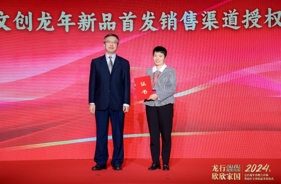 图为总台文创为中石化易捷颁发龙年新品首发销售渠道授权证书