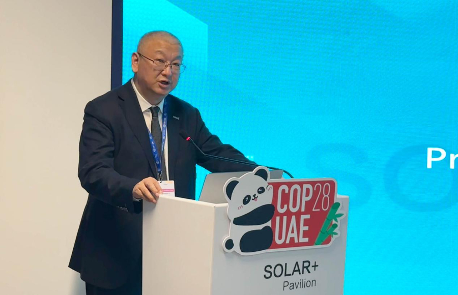 隆基绿能创始人、总裁李振国在COP28大会蓝区的Solar+ Pavilion“绿色电力助力气候行动与生物多样性保护”边会上致辞。