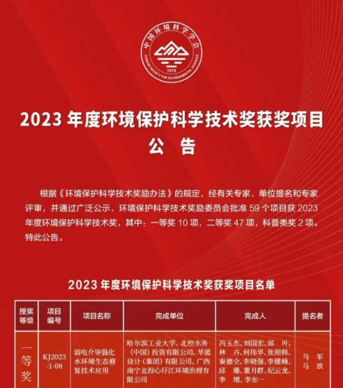 2023年12月25日,中国环境科学学会发布《2023年度环境保护科学技术奖获奖项目公告》,北控水务参与申报的“弱电介导强化水环境生态修复技术应用”荣获一等奖。本次共批准59个项目,其中一等奖10项,二等奖47项,科普类奖2项。