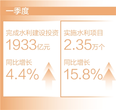 完成水利建设投资创历史同期最高纪录。一季度,完成水利建设投资1933亿元,同比增长4.4%;落实水利投资7787亿元,同比增长93.3%。目前,增发国债水利项目已实施4753个,完成投资767.5亿元,总体进展顺利。
