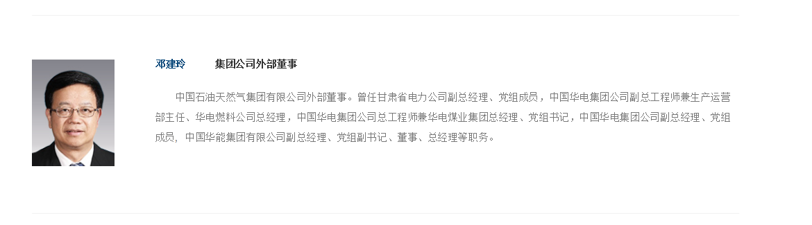 据中石油官网显示,邓建玲,男,汉族,1965年。现任中国石油天然气集团有限公司外部董事。曾任甘肃省电力公司副总经理、党组成员,中国华电集团公司副总工程师兼生产运营部主任、华电燃料公司总经理,中国华电集团公司总工程师兼华电煤业集团总经理、党组书记,中国华电集团公司副总经理、党组成员,中国华能集团有限公司副总经理、党组副书记、董事、总经理等职务。