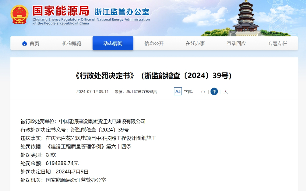 近日,国家能源局浙江监管办公室发布的《行政处罚决定书》(浙监能稽查〔2024〕39号)显示,中国能源建设集团浙江火电建设有限公司在庆元百花岩风电项目中不按照工程设计图纸施工,被处以619.428974万元罚款。