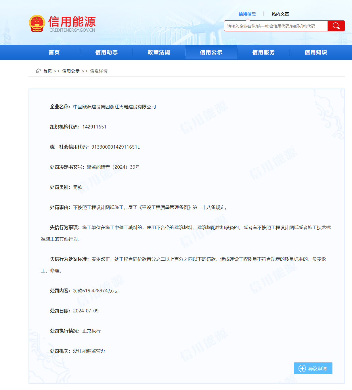 浙江能源监管办发布的《行政处罚决定书》(浙监能稽查〔2024〕39号)中依据《建设工程质量管理条例》(下称“条例”)第六十四条对中国能建浙江火电处以了619万余元的罚款。条例明确:施工单位在施工中偷工减料的,使用不合格的建筑材料、建筑构配件和设备的,或者有不按照工程设计图纸或者施工技术标准施工的其他行为的,责令改正,处工程合同价款百分之二以上百分之四以下的罚款;造成建设工程质量不符合规定的质量标准的,负责返工、修理,并赔偿因此造成的损失;情节严重的,责令停业整顿,降低资质等级或者吊销资质证书。
