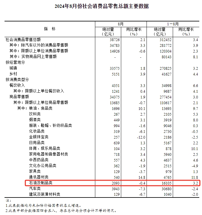 数据显示,8月份,社会消费品零售总额38726亿元,同比增长2.1%。其中,石油及制品类消费品零售额2093亿元,同比下降0.4%,是年内首次同比出现下跌。