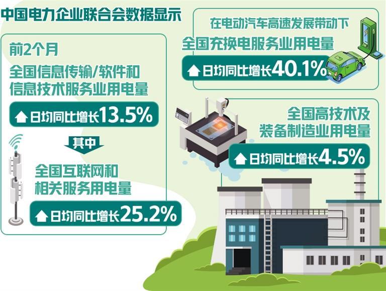 不过,在“两重”“两新”等政策拉动下,部分行业电力消费仍保持较快增长。中国电力企业联合会数据显示,前2个月,全国信息传输/软件和信息技术服务业用电量日均同比增长13.5%,其中,在AI、大数据、云计算、5G等快速发展带动下,全国互联网和相关服务用电量日均同比增长25.2%。