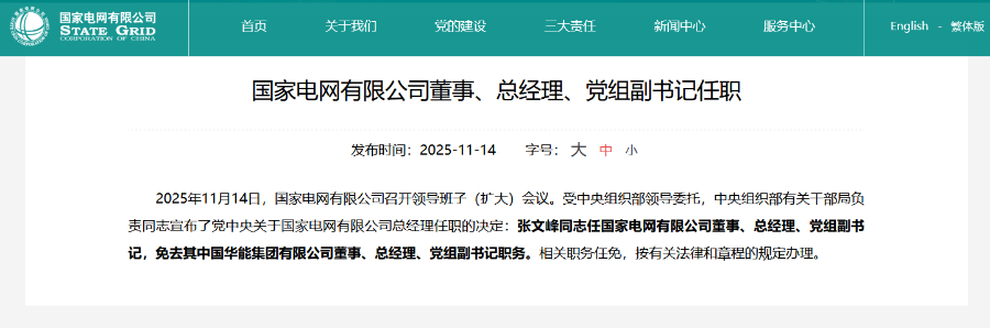 2025年11月14日,国家电网有限公司召开领导班子(扩大)会议。受中央组织部领导委托,中央组织部有关干部局负责同志宣布了党中央关于国家电网有限公司总经理任职的决定:张文峰同志任国家电网有限公司董事、总经理、党组副书记,免去其中国华能集团有限公司董事、总经理、党组副书记职务。相关职务任免,按有关法律和章程的规定办理。