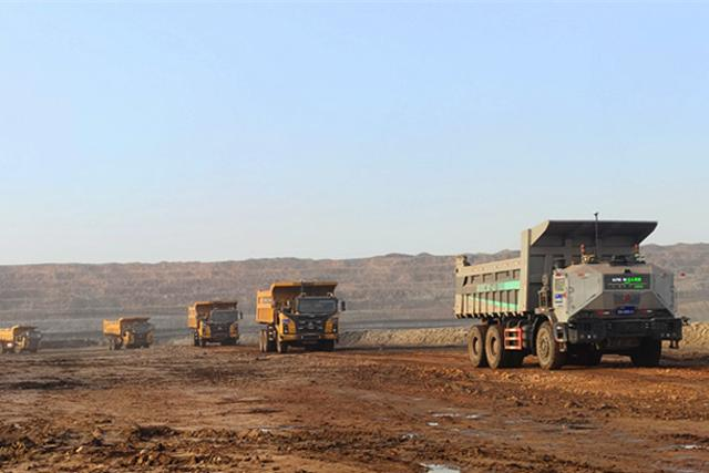 图为运输机器人带领无人驾驶矿卡奔驰采场