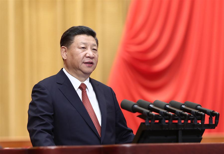 Chinese President Xi Jinping, also general secretary of the Communist Party of China Central Committee and chairman of the Central Military Commission, addresses a grand gathering in celebration of the 90th founding anniversary of the People's Liberation Army (PLA) at the Great Hall of the People in Beijing, capital of China, Aug. 1, 2017. (Xinhua/Ju Peng)