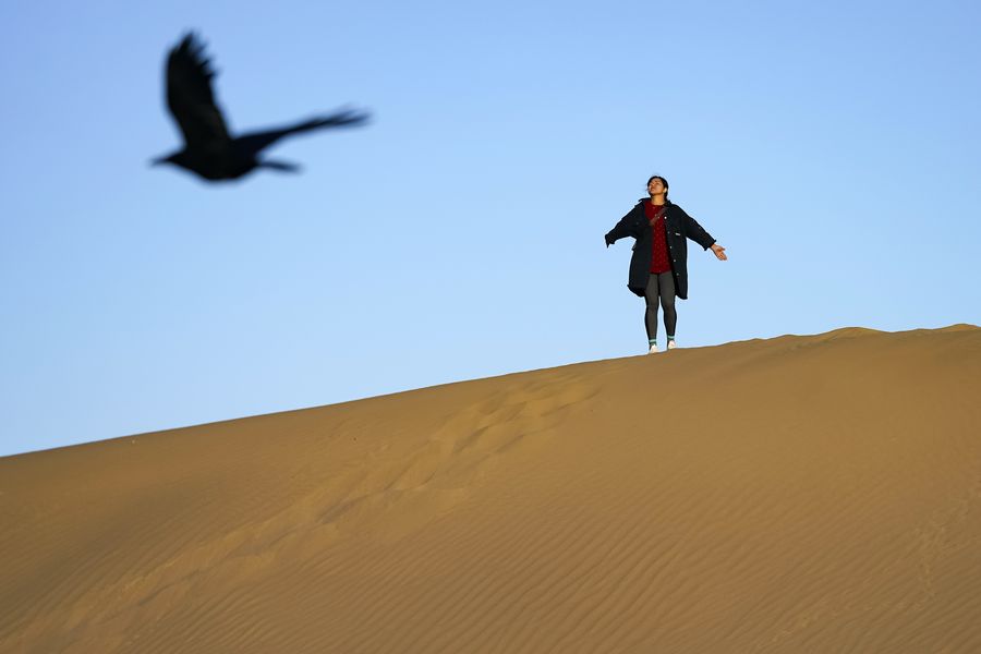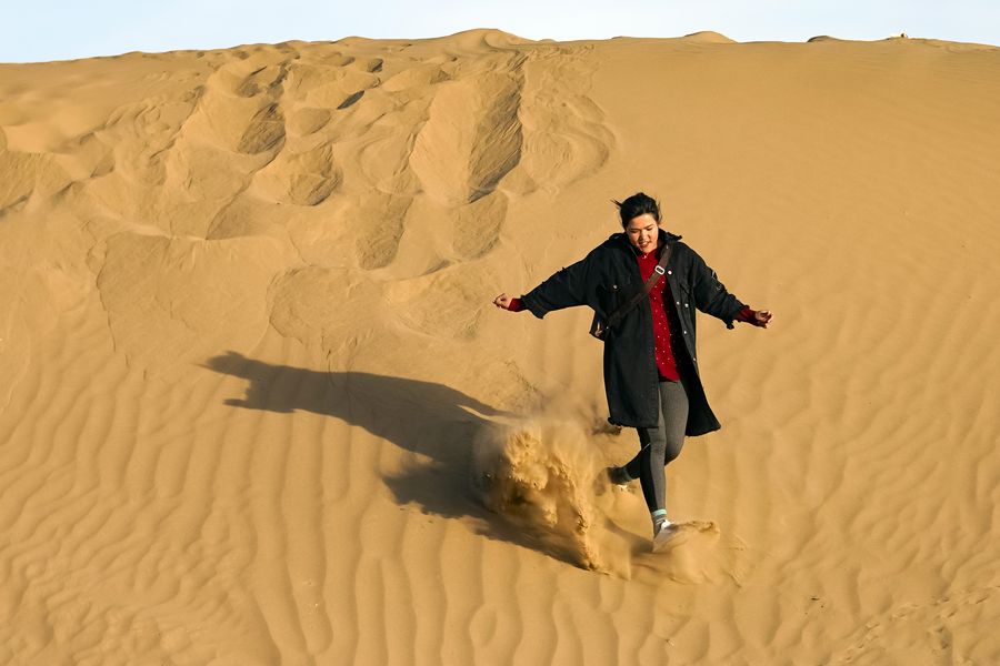 Kurbanhan Matrozi enjoys herself at a dune near her home in Darya Boyi Township, Yutian County of northwest China's Xinjiang Uygur Autonomous Region, Nov. 13, 2019. (Xinhua/Shen Bohan)