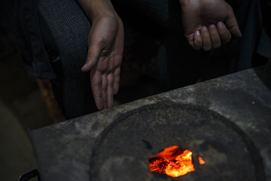 Kurbanhan Matrozi warms herself by a fire at the home of a member of the "Desert Watcher" tourism cooperation in Darya Boyi Township, Yutian County of northwest China's Xinjiang Uygur Autonomous Region, Nov. 13, 2019. (Xinhua/Hu Huhu)