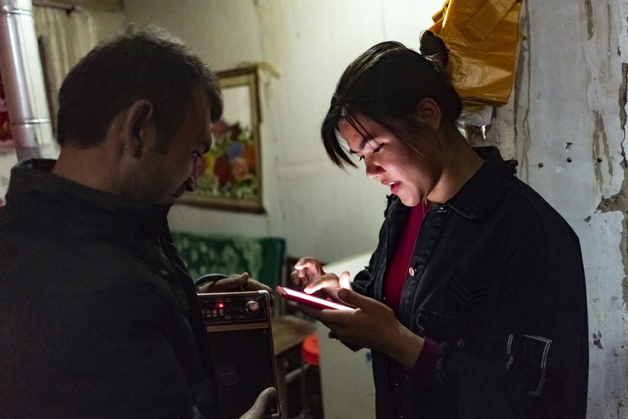 Kurbanhan Matrozi (R) helps a member of the "Desert Watcher" tourism cooperation link cellphone with a bluetooth sound box in Darya Boyi Township, Yutian County of northwest China's Xinjiang Uygur Autonomous Region, Nov. 13, 2019. (Xinhua/Shen Bohan)