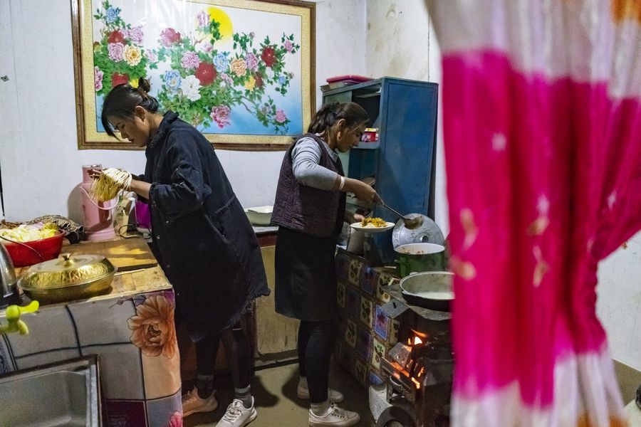 Kurbanhan Matrozi (L) helps a member of the "Desert Watcher" tourism cooperation prepare local food to greet visitors in Darya Boyi Township, Yutian County of northwest China's Xinjiang Uygur Autonomous Region, Nov. 13, 2019. (Xinhua/Shen Bohan)