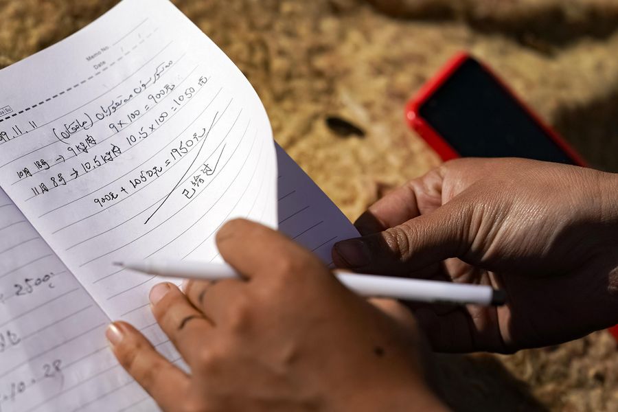 Kurbanhan Matrozi settles accounts with a sheep breeding cooperation in Darya Boyi Township, Yutian County of northwest China's Xinjiang Uygur Autonomous Region, Nov. 13, 2019. (Xinhua/Shen Bohan)