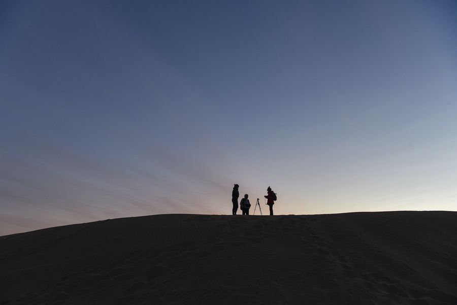 Kurbanhan Matrozi (L) and visitors take photos of the sunrise at a dune in Darya Boyi Township, Yutian County of northwest China's Xinjiang Uygur Autonomous Region, Nov. 14, 2019. (Xinhua/Hu Huhu)