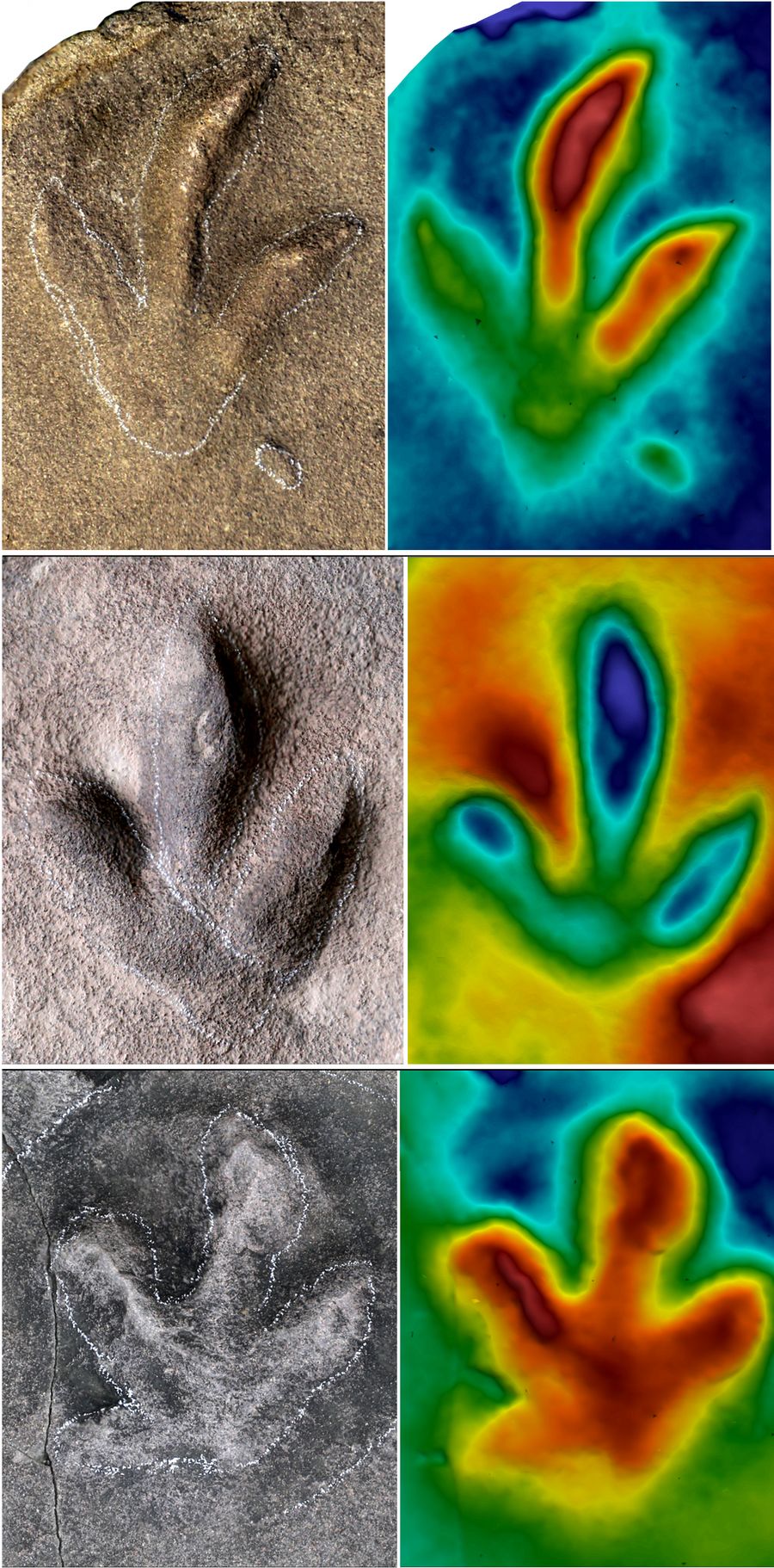 This combination photo shows dinosaur footprints discovered in Chengde, Hebei Province, north China. (Provided to Xinhua)