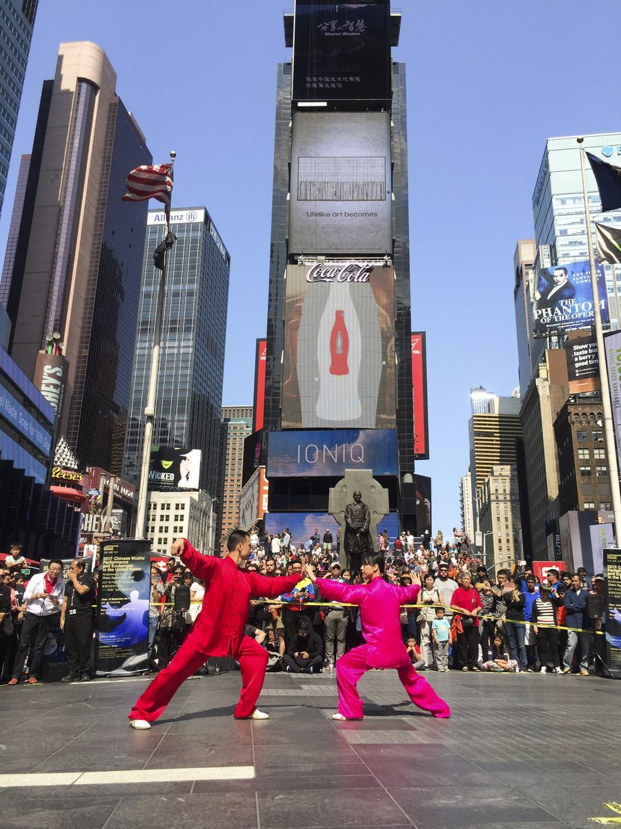 Chen Sitan and his wife Lin Xu perform at Times Sqaure in New York, the United States, Sept. 10, 2017. (Xinhua)