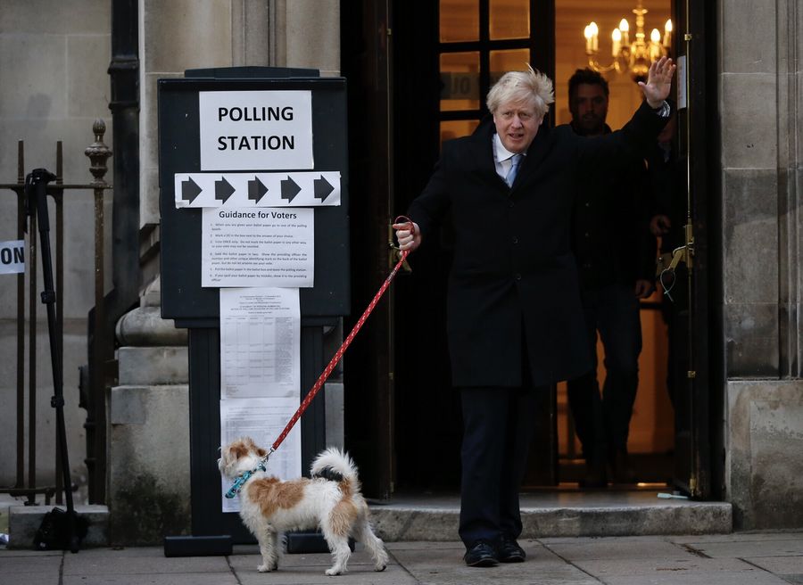 British Prime Minister and Conservative Party leader Boris Johnson leaves a polling station after casting his vote for the general election in London, Britain, on Dec. 12, 2019. (Xinhua/Han Yan)
