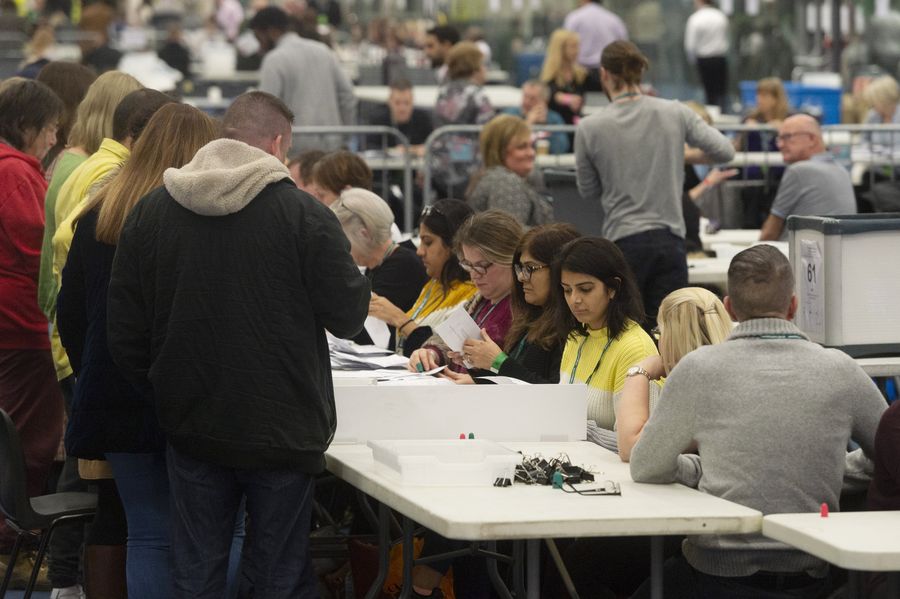 Staff count ballots for the general election at Brunel University in Uxbridge, London, Britain, Dec. 12, 2019. (Photo by Ray Tang/Xinhua)