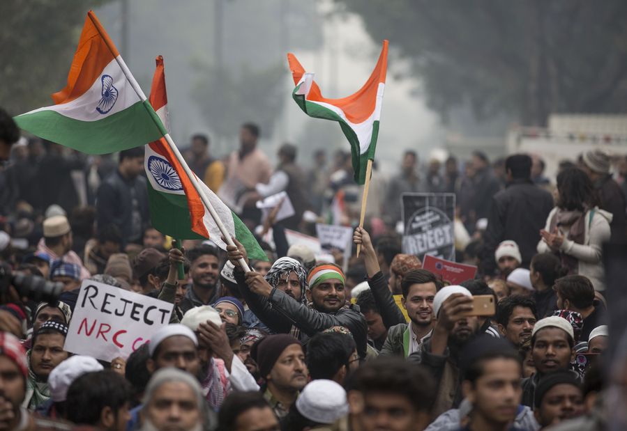 People participate in a protest against the new citizenship law in New Delhi, India, Dec. 19, 2019. (Photo by Xinhua/Javed Dar)