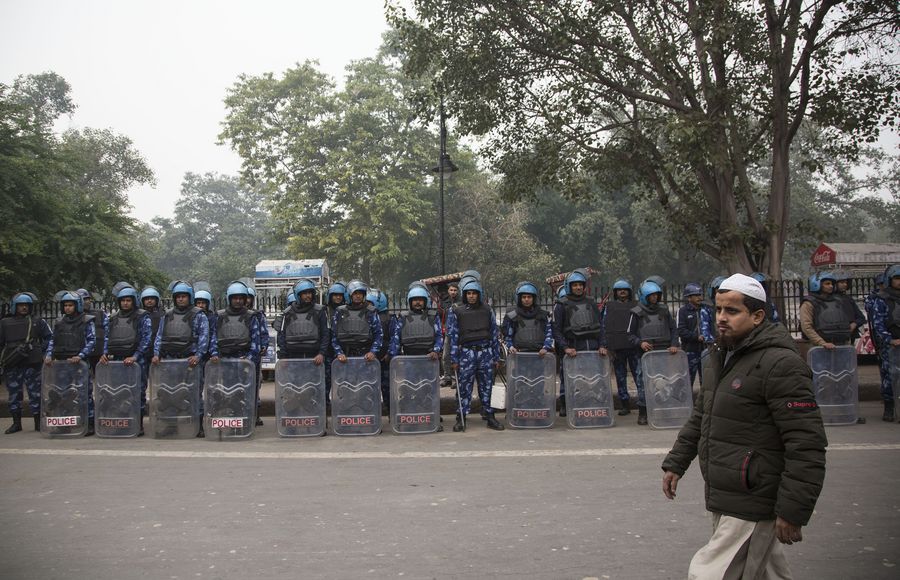 A man walks past Indian paramilitary troopers as they stand guard during a protest against the new citizenship law in New Delhi, India, Dec. 19, 2019. (Xinhua/Javed Dar)
