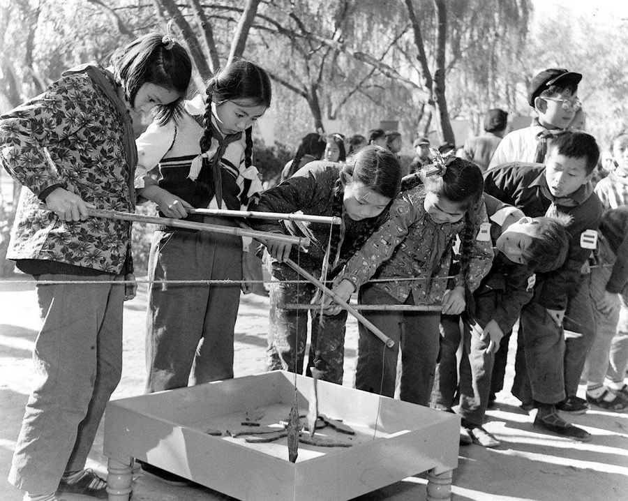 File photo taken on Nov. 5, 1957 shows children playing a fishing game at the Jingshan Park in Beijing, capital of China. (Xinhua/Zheng Xiaozhen)