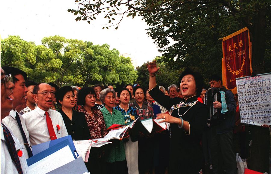 Photo taken in December 1998 shows a group of eldly people practicing chorus at the Luxun Park in Shanghai, east China. (Xinhua/Fan Jun)