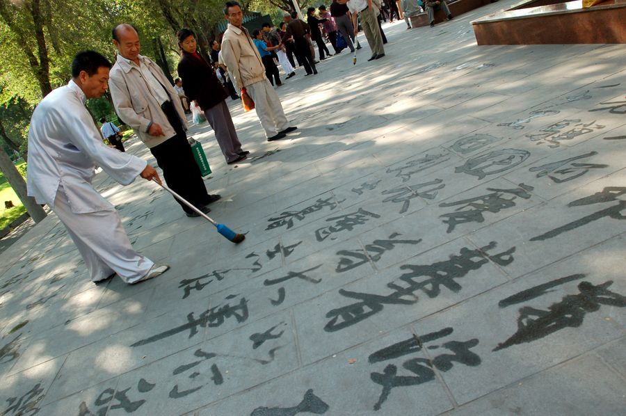A man practices Chinese calligraphy on the ground at the Renmin Park in Urumqi, northwest China's Xinjiang Uygur Autonomous Region, Aug. 19, 2007. (Xinhua/Wang Min)