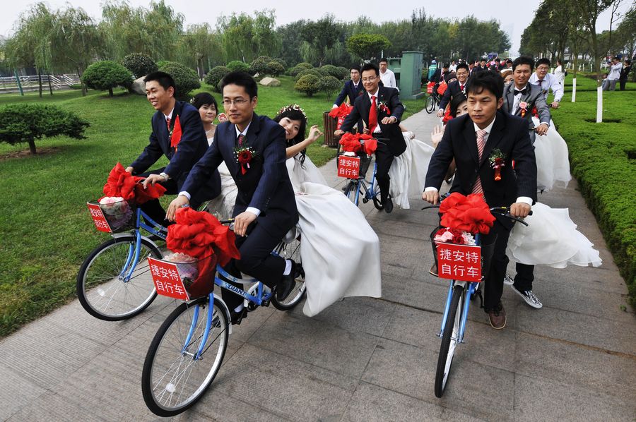People hold a group wedding ceremony at a beach park in Rizhao, east China's Shandong Province, Oct. 1, 2010. (Photo by Chen Weifeng/Xinhua)