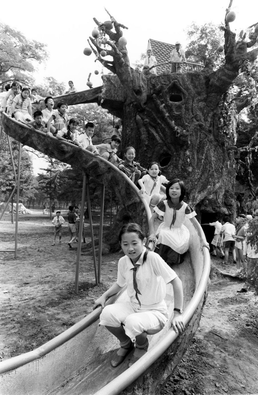 Children play on a slide at the Tiantan Park in Beijing, capital of China, June 1, 1989. (Xinhua/Song Lianfeng)