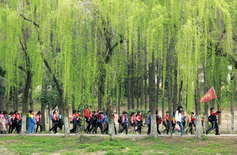 Students have a spring outing at the Suihe Park in Huaibei City, east China's Anhui Province, April 4, 2019. (Photo by Zhou Fangling/Xinhua)■