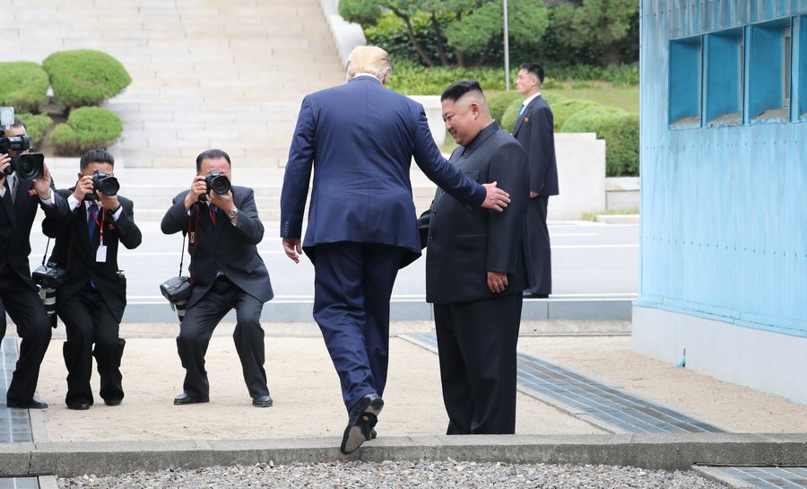 U.S. President Donald Trump crosses the inter-Korean border to become the first sitting U.S. president to step in the Democratic People's Republic of Korea (DPRK) since the end of the 1950-53 Korean War, June 30, 2019. (Xinhua/NEWSIS)