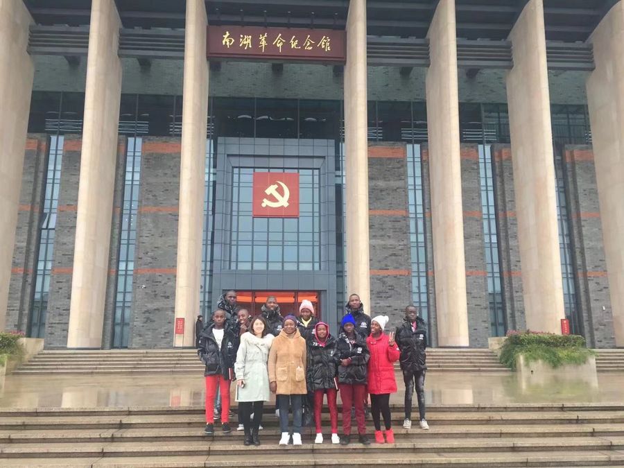 Ten students drawn from Cyclone Idai affected regions of Zimbabwe took group photos before visiting Nanhu Revolutionary Memorial Hall in Jiaxing, Zhejiang Province, China, Dec. 25, 2019. (Xinhua/Chinese Embassy in Zimbabwe)