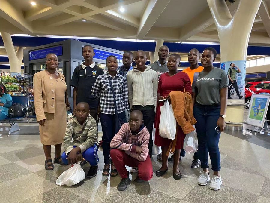 Ten students drawn from Cyclone Idai affected regions of Zimbabwe took group photos in Harare R.G. Mugabe International Airport before flying to China's Zhejiang province in Harare, Zimbabwe, Dec. 21, 2019. (Xinhua/Chinese Embassy in Zimbabwe)