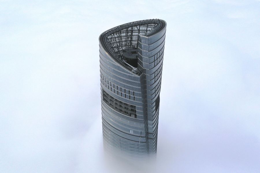 The Shanghai Tower, a 632-meter skyscraper, is surrounded by thick fog in east China's Shanghai, April 19, 2019. (Xinhua/Shen Chunchen)