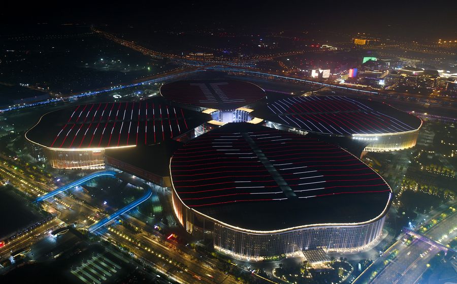 A night view of the National Exhibition and Convention Center (Shanghai), the venue of the second China International Import Expo (CIIE), in east China's Shanghai, Oct. 28, 2019. (Xinhua/Ding Ting)