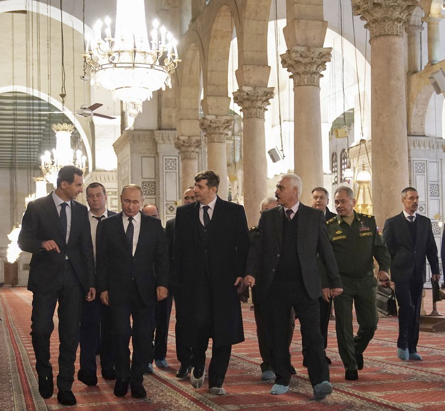 Syrian President Bashar al-Assad (1st L) and Russian President Vladimir Putin (2nd L Front) visit the Umayyad Mosque in Damascus, Syria, Jan. 7, 2020. Vladimir Putin arrived in Damascus on Tuesday and met with Bashar al-Assad. (Syrian Presidency/Handout via Xinhua)