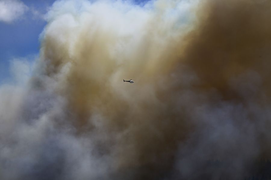 A helicopter is seen battling a forest fire in the north of Napier, New Zealand's North Island, Jan. 6, 2020. A large forest fire broke out on Monday in the north of Napier in New Zealand's North Island. (Hayden Woodward/Handout via Xinhua)