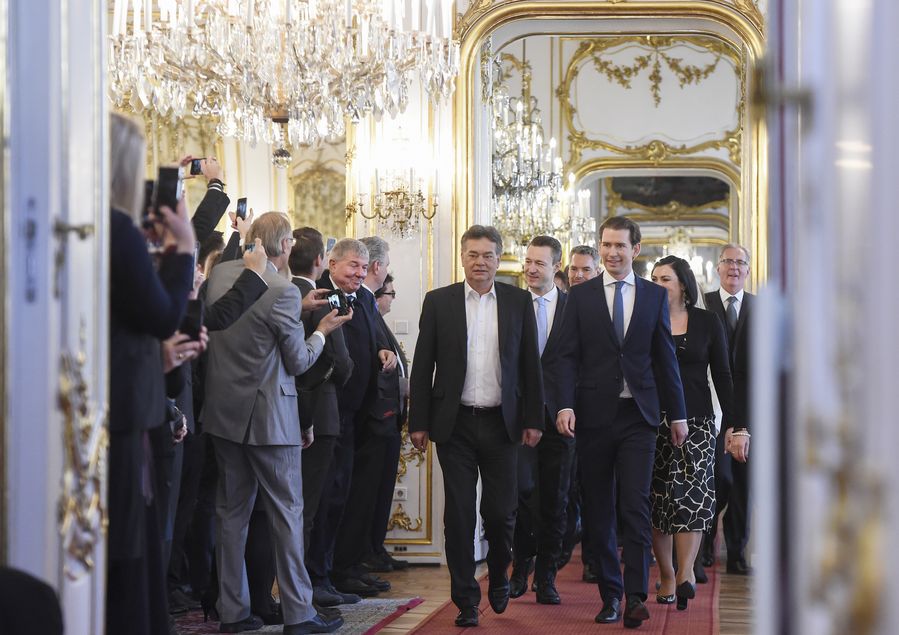 Austria's new Chancellor Sebastian Kurz (1st R Front) and new Vice Chancellor Werner Kogler (2nd R Front) enter the swearing-in ceremony in Vienna, Autstria, Jan. 7, 2020. Austria's new coalition government was sworn in on Tuesday. (Xinhua/Guo Chen)