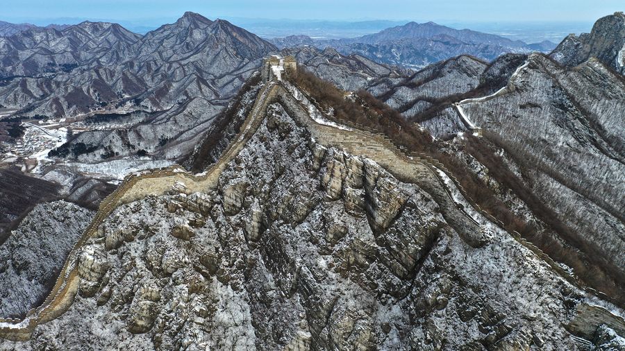 Aerial photo taken on Jan. 7, 2020 shows a snow view of the Jiankou Great Wall in Beijing, capital of China. (Xinhua/Chen Yehua)