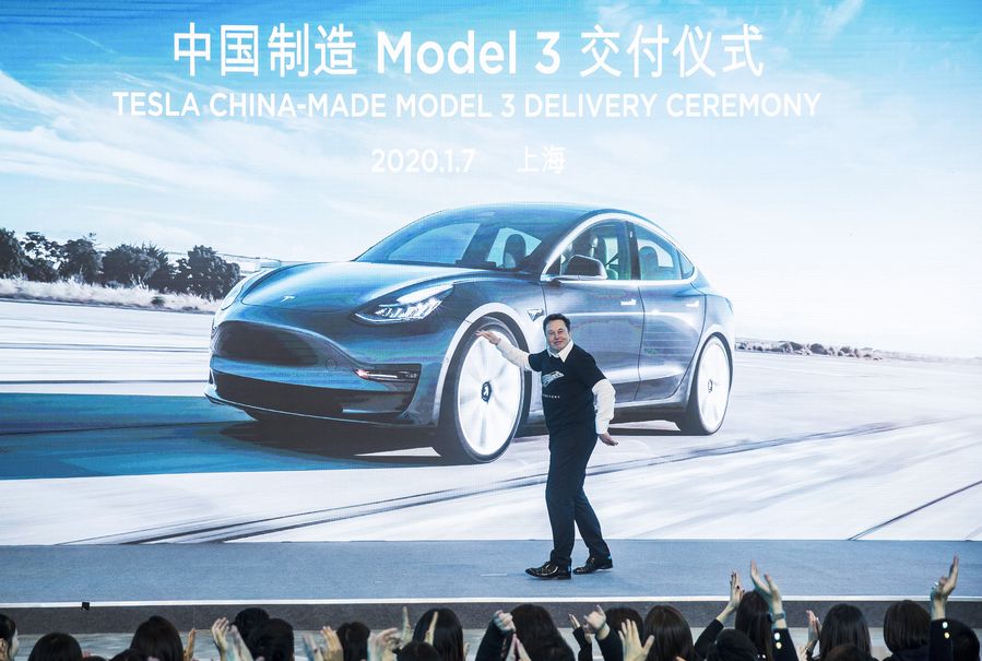 Tesla CEO Elon Musk gestures at a delivery ceremony for Tesla China-made Model 3 in Shanghai, east China, Jan. 7, 2020. U.S. electric carmaker Tesla officially launched its China-made Model Y program in its Shanghai gigafactory Tuesday, one year after the company broke ground on its first overseas plant. The first batch of China-produced Model 3 sedans was also delivered to its non-employee customers at an opening ceremony for the program. (Xinhua/Ding Ting)