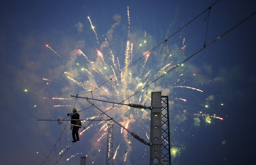 An electrician sets the electric system for a railway line linking Xinfeng and Yaocun in Xi'an, capital of northwest China's Shaanxi Province, Jan. 7, 2020. (Xinhua/Liu Xiao)