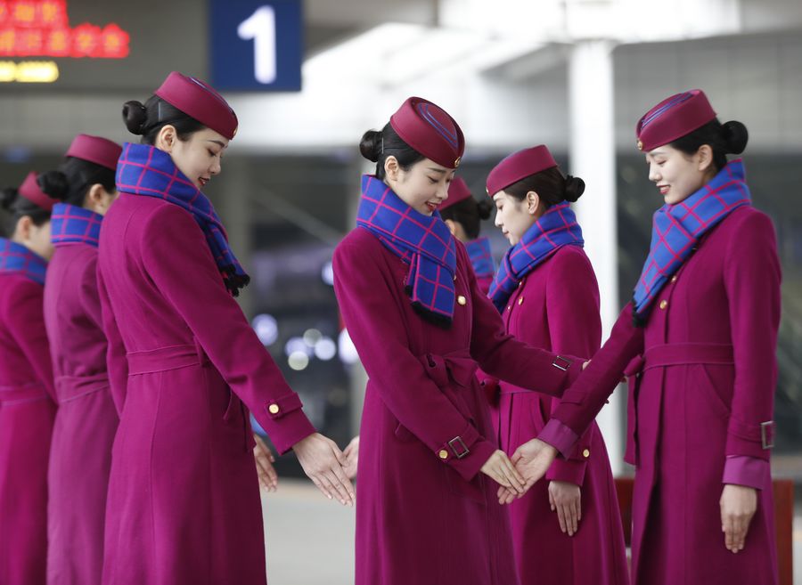 Stewardesses from Chongqing section of China Railway Chengdu Group Co., Ltd attend the business and etiquette training to welcome the upcoming Spring Festival travel rush in southwest China's Chongqing Municipality, Jan. 6, 2020. (Photo by Huangwei/Xinhua)