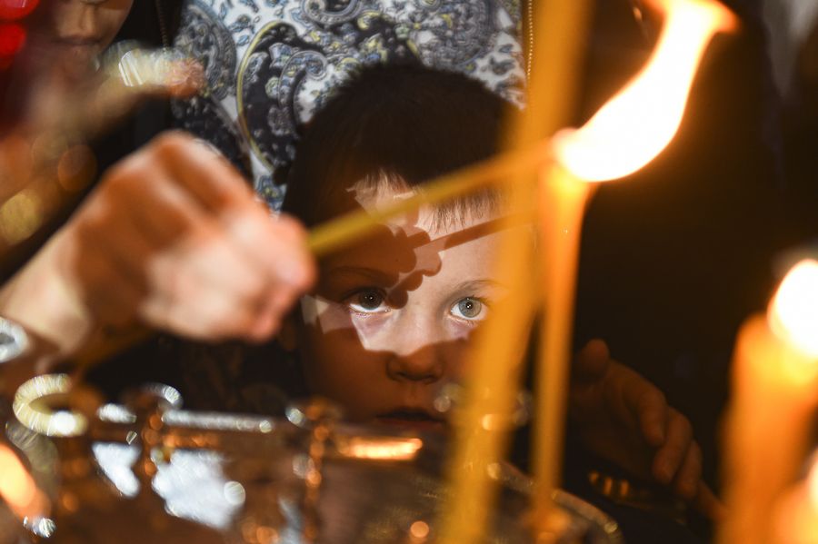 A boy lights a candle during the Christmas service in the Cathedral of Christ the Saviour in Moscow, Russia, Jan. 6, 2019. Orthodox Christians celebrate Christmas on Jan. 7 according to the Julian calendar. (Xinhua/Evgeny Sinitsyn)■